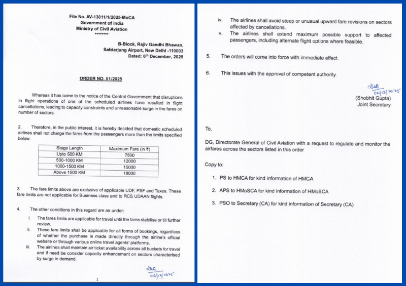 Through Order No. 01/2025, issued on 6 December 2025, the Ministry imposed a temporary ceiling on economy-class domestic airfares—ensuring airlines cannot exceed a defined pricing range until flight operations return to normal.